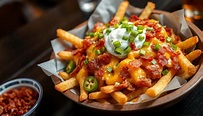 Loaded fries are noted for being a cheap but filling dish. They are served with various toppings.[1][2] Common ingredients include cheese, chopped bacon, and garnishes.